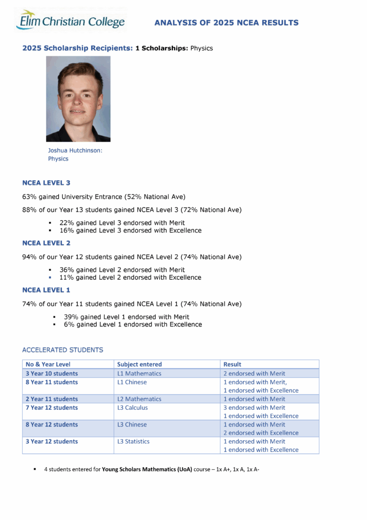 Students who have achieved a significant number of excellence results in any Level 2 subject should consider entering scholarship in that subject. Scholarship is a monetary award to recognise top students. It will not attract credits nor contribute towards a qualification but the fact that a student has gained a scholarship will appear on their Record of Achievement.